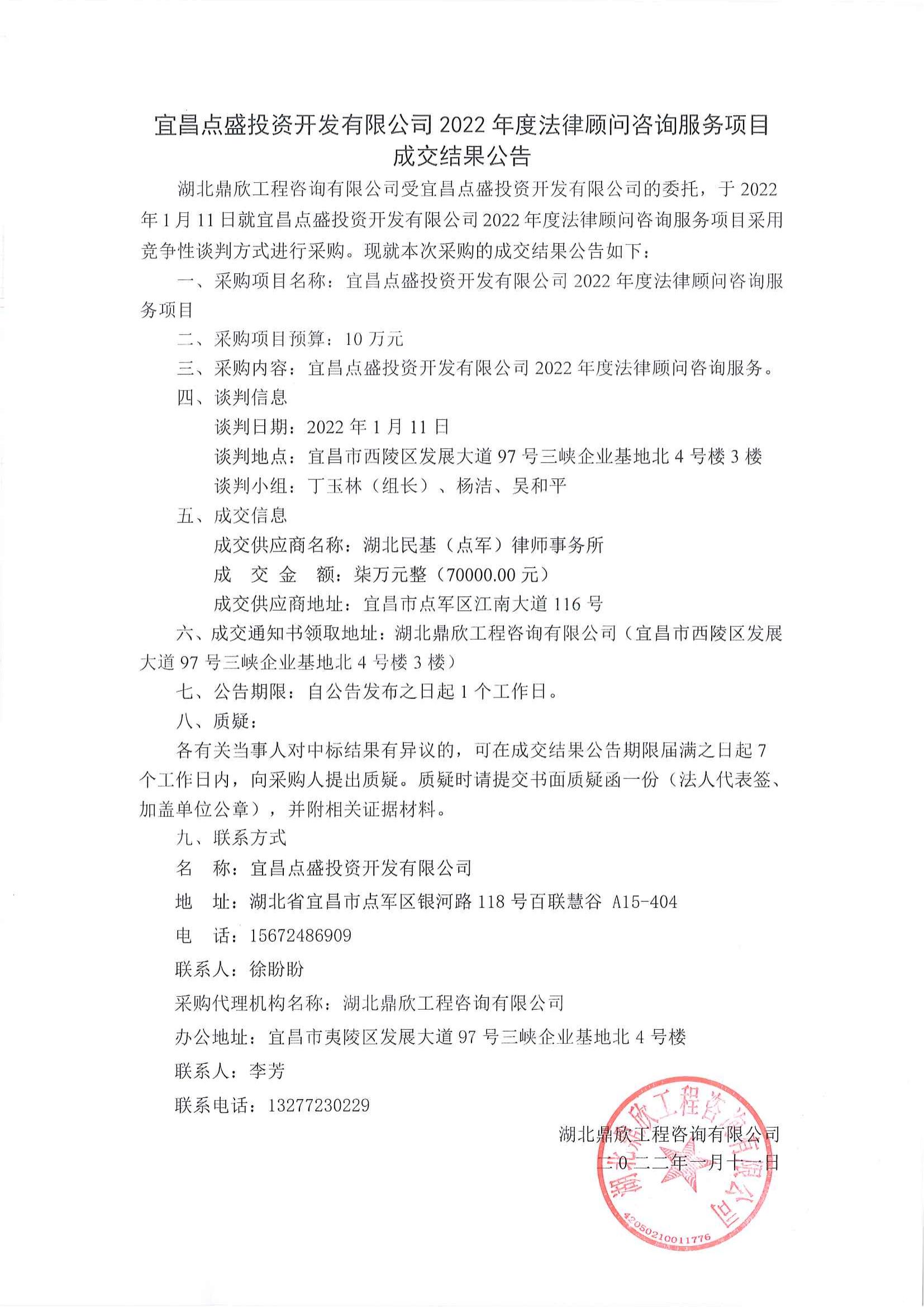 宜昌點(diǎn)盛投資開發(fā)有限公司2022年度法律顧問(wèn)咨詢服務(wù)項(xiàng)目成交公告