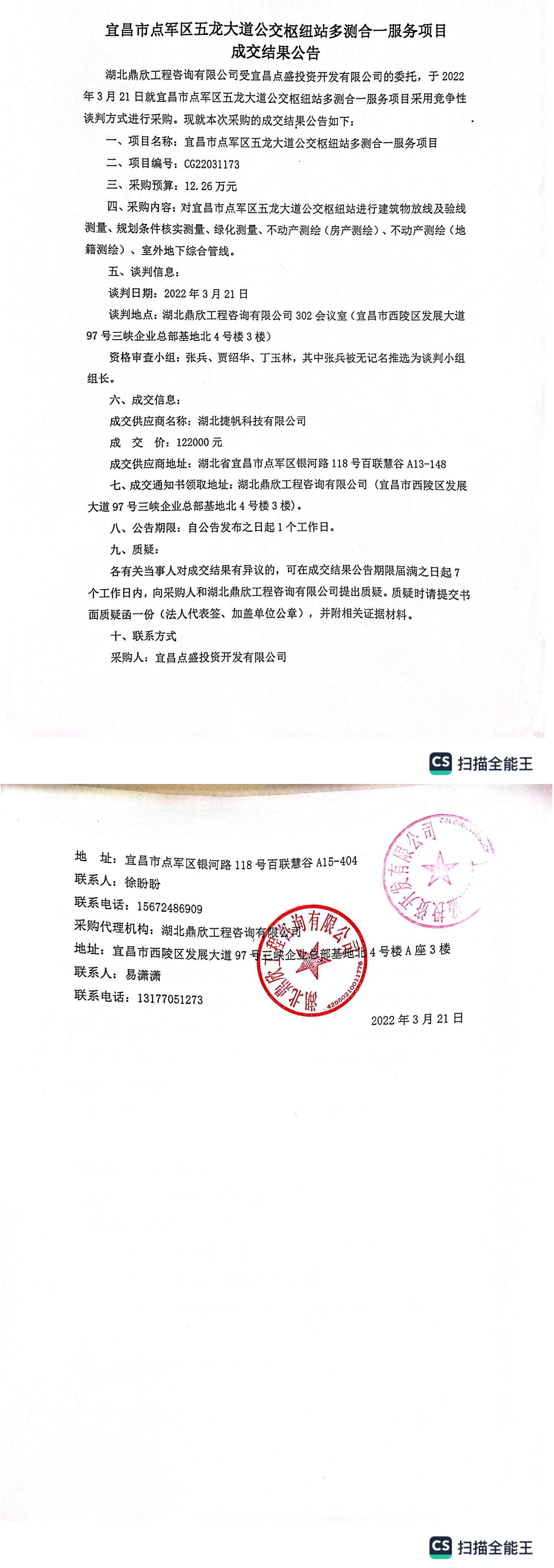 宜昌市點(diǎn)軍區(qū)五龍大道公交樞紐站多測合一服務(wù)項(xiàng)目成交結(jié)果公告