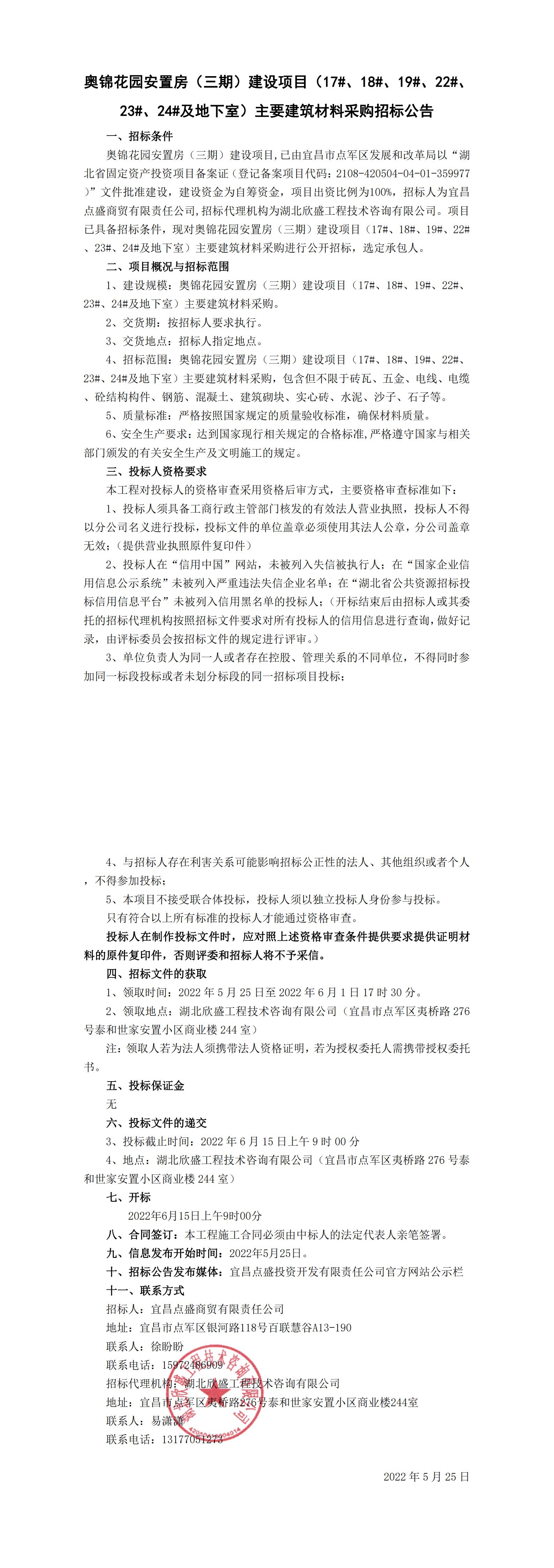 宜昌點(diǎn)盛商貿(mào)有限責(zé)任公司關(guān)于對奧錦花園安置房(三期)建設(shè)項(xiàng)目(17#、18#、19#、22#、23#、24#及地下室)主要建筑材料的采購公告