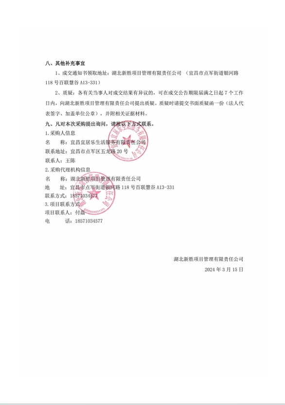 宜昌宜居樂(lè)生活服務(wù)有限責(zé)任公司商業(yè)物業(yè)保潔及秩序維護(hù)服務(wù)項(xiàng)目成交結(jié)果公告