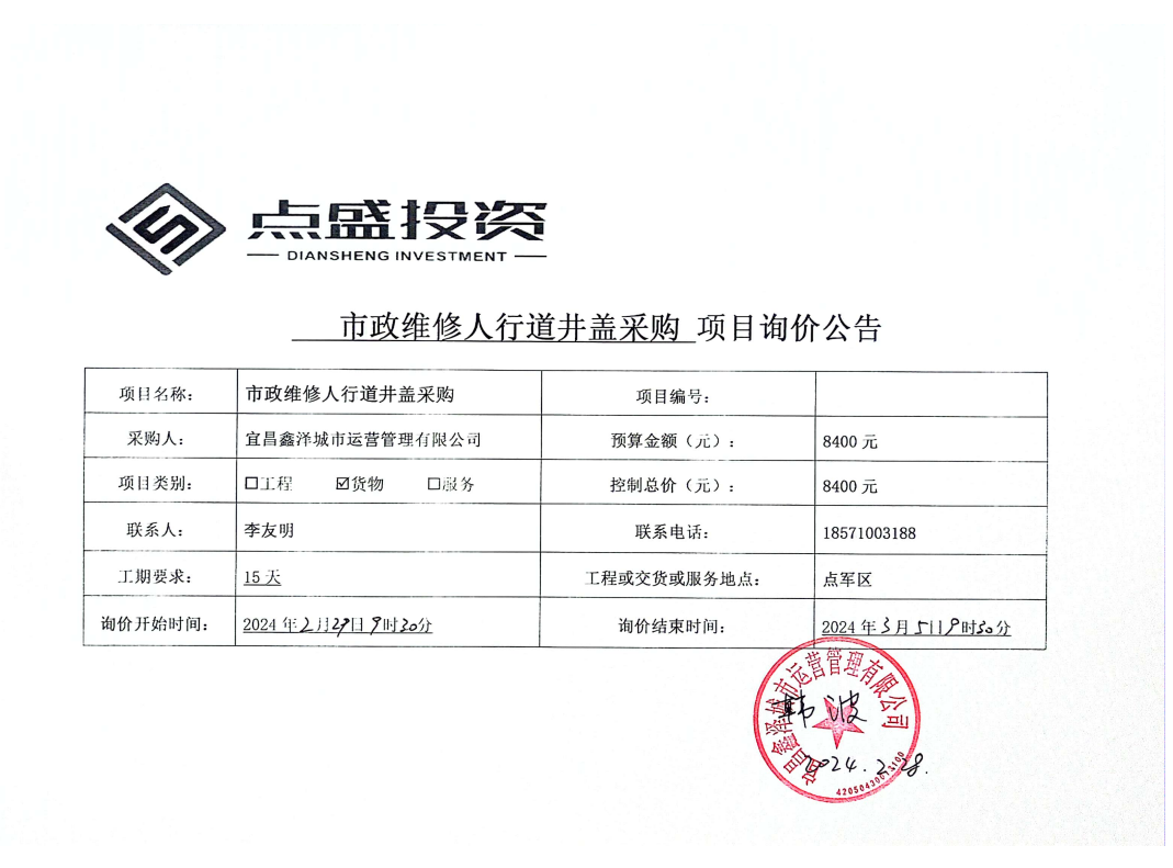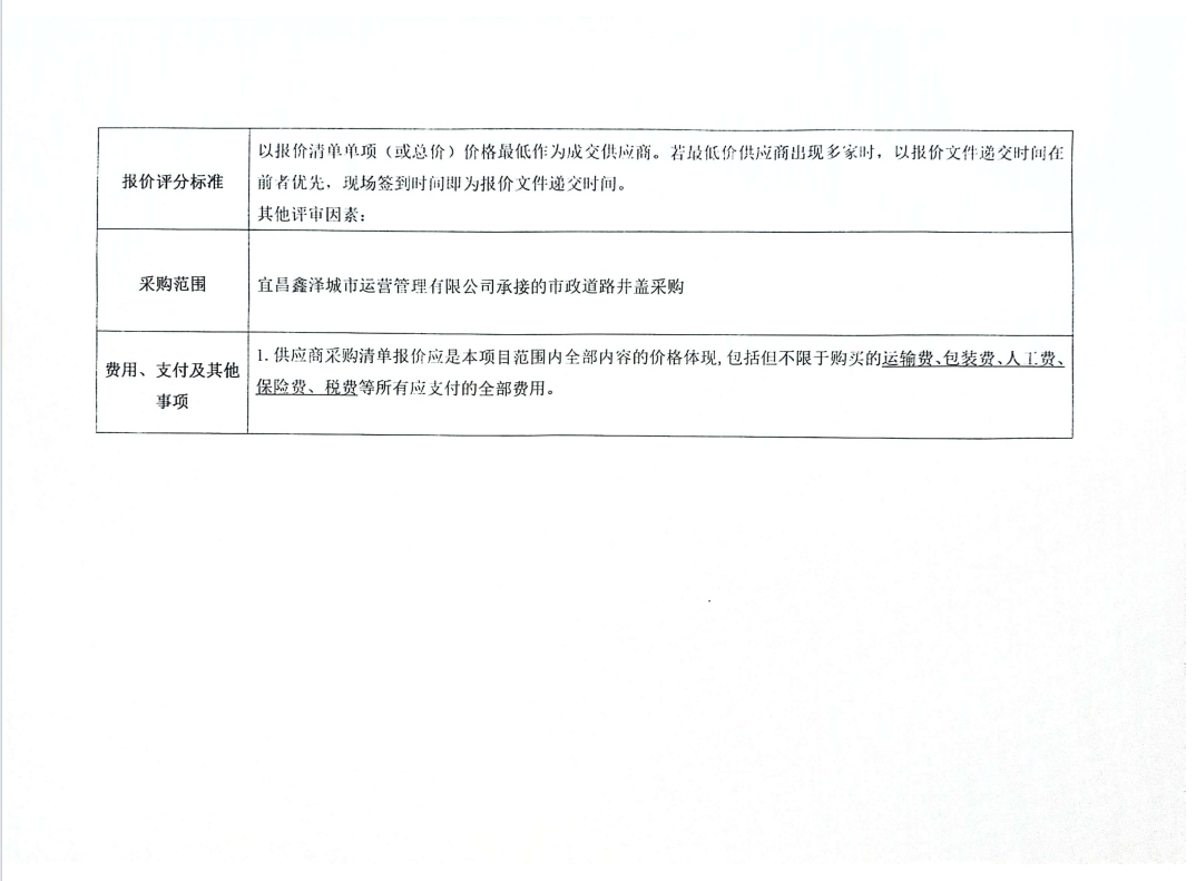 宜昌鑫澤城市運(yùn)營(yíng)管理有限公司市政維修人行道井蓋采購(gòu)項(xiàng)目詢(xún)價(jià)公告