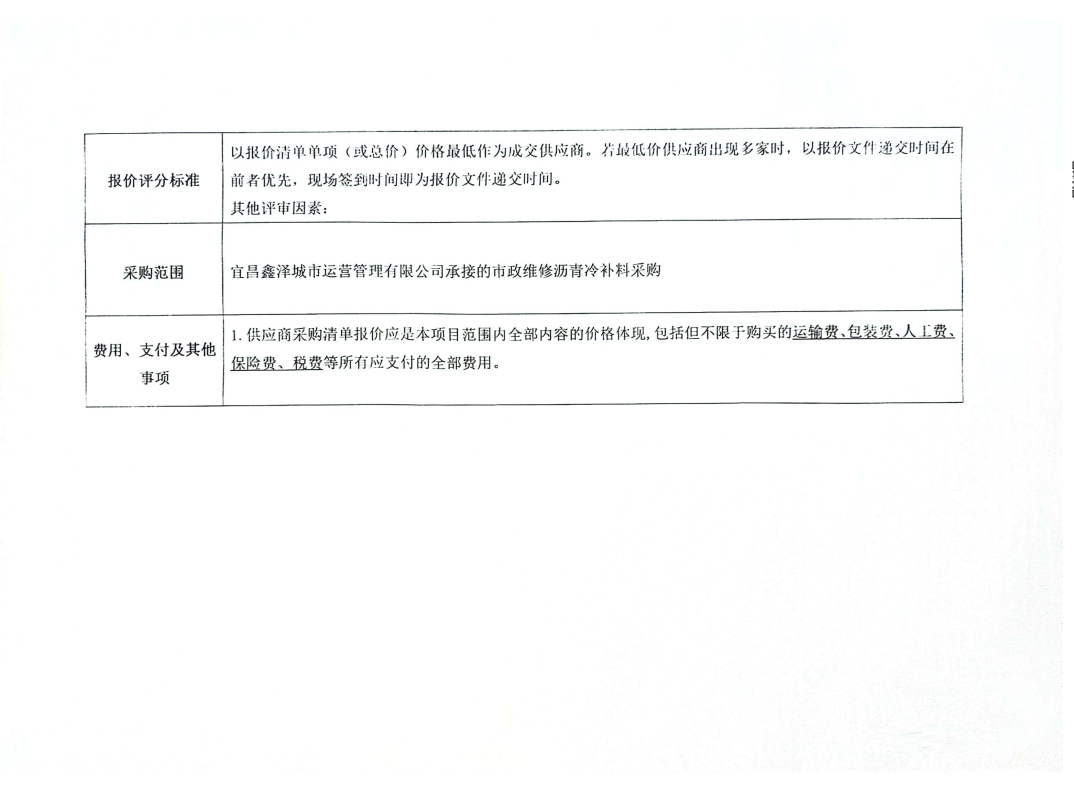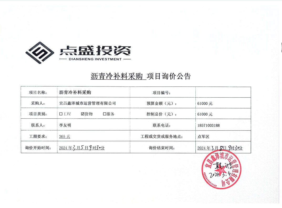 宜昌鑫澤城市運(yùn)營(yíng)管理有限公司瀝青冷補(bǔ)料采購(gòu)項(xiàng)目詢(xún)價(jià)公告