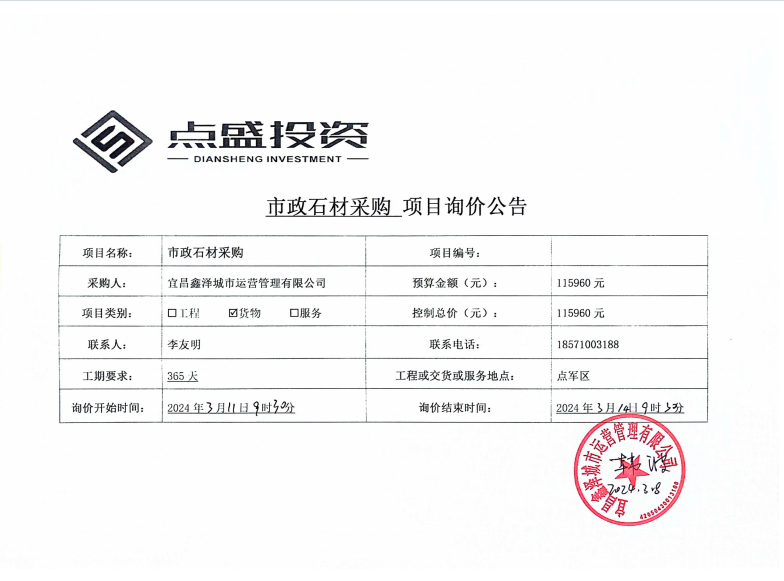 宜昌鑫澤城市運營管理有限公司市政維修石材采購項目詢價公告