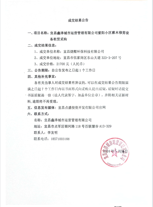 宜昌鑫澤城市運(yùn)營管理有限公司管紫陽小區(qū)灌木修剪設(shè)備租賃采購項(xiàng)目成交公告