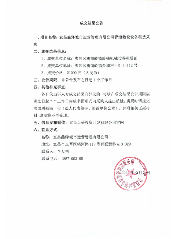 宜昌鑫澤城市運營管理有限公司管道敷設(shè)設(shè)備租賃采購項目