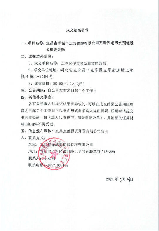 萬(wàn)壽養(yǎng)老污水預(yù)埋設(shè)備租賃采購(gòu)成交公告