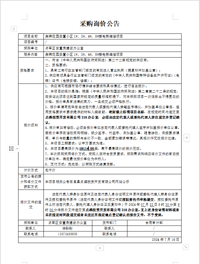 奧錦花園安置小區(qū)1#、3#、4#、8#樓電梯維修項(xiàng)目詢(xún)價(jià)公告