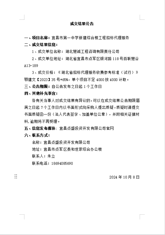 宜昌市第一中學(xué)新建綜合樓工程招標代理服務(wù)成交公告