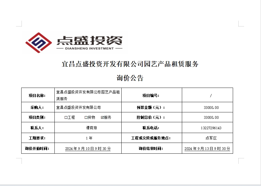 宜昌點(diǎn)盛投資開(kāi)發(fā)有限公司園藝產(chǎn)品租賃服務(wù)詢價(jià)公告