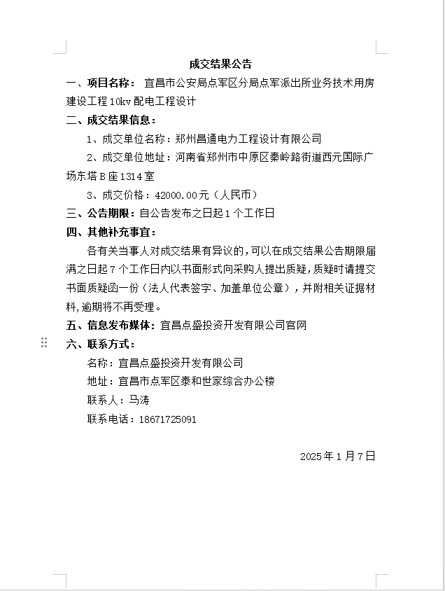 宜昌市公安局點(diǎn)軍區(qū)分局點(diǎn)軍派出所業(yè)務(wù)技術(shù)用房建設(shè)工程10kv配電工程設(shè)計(jì)成交公告